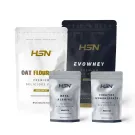 Complete sports pack with Evowhey Protein 2 kg, Instant Oat Flour 1 kg, Micronized Creatine Monohydrate 500 g, and Beta-Alanine 500 g.