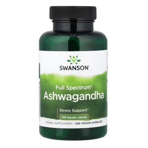 Full Spectrum® Ashwagandha 450mg from Swanson is a dietary supplement made from pure ashwagandha root in veggie capsules.