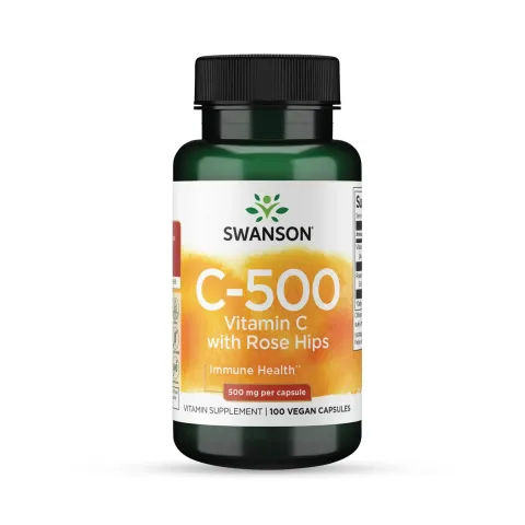 Vitamin C + Rosehip 500mg by Swanson is a dietary supplement of vitamin C capsules in the form of ascorbic acid, plus Rosehip extract.